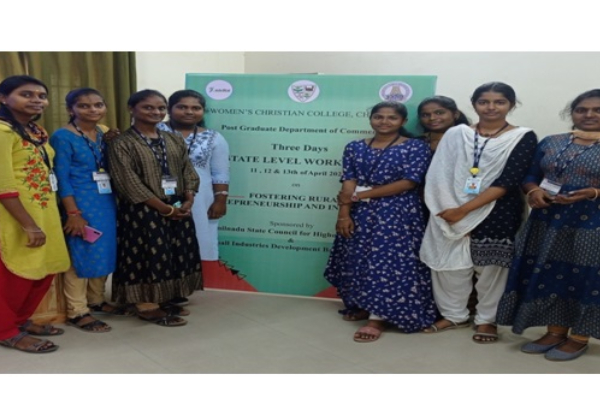 3 Days Workshop On Fostering Rural Entrepreneurship And Innovation On 11,12 &13th April 2022 At Women’s Christian College, Chennai – Sponsored By Tamilnadu State Council For Higher Education & Small Industries Development Bank Of India. Totally 8 students from B.Com and BBA and one staff member participated. Entrepreneurs from various fields interacted with the students and they shared their experience as an entrepreneur. And also they motivated the students to start the business at the earliest. Students gained knowledge about entrepreneurship.