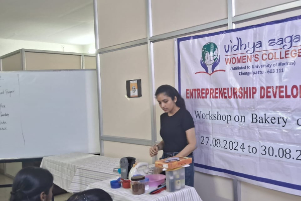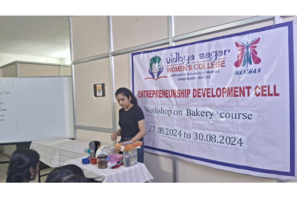 On 27th August to 30th August,2024 the ED cell of VSWC organized an enlightening ‘CAKE BAKING’ workshop session in two batches of 32 Students each, by Ms. Neha, Alumni of VSWC, the founder of bakers table and also GST consultant. Totally 64 Students were captivated by this workshop.
