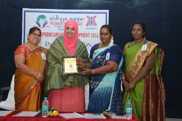 The Entrepreneurship Development Cell of Vidhya sagar women’s college organized the inaugural ceremony on 26th August 2022 at Bhagwan Aadinath auditorium. The programme started at 10.30 am. Ms. J.Yuvarani, III BBM delivered the welcome speech. Dr. R.Rekha, Head of the department of Tamil honoured the chief guest. Ms. Riffath Shanaz(a) RIA, Entrepreneur, Ria Mehandhi’s, Henna Artist, the chief guest of the inaugural programme delivered the keynote address and explained the journey on becoming an entrepreneur. She motivated the students to keep the spirit of entrepreneurship active in them. The students got a chance to ask questions and clear their doubts from the chief guest. The vote of thanks was delivered by C.Saritha III BBA, the president of ED Cell.